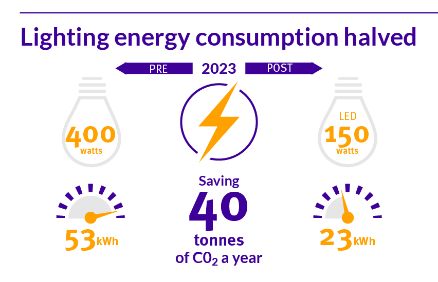 Since our new LED lights went live, we’ve more than halved our energy consumption required for lighting from 53 kWh to 23 kWh, which saves 40 tonnes of CO2 a year. That means that we’ve reduced our lighting energy consumption by over 50%.